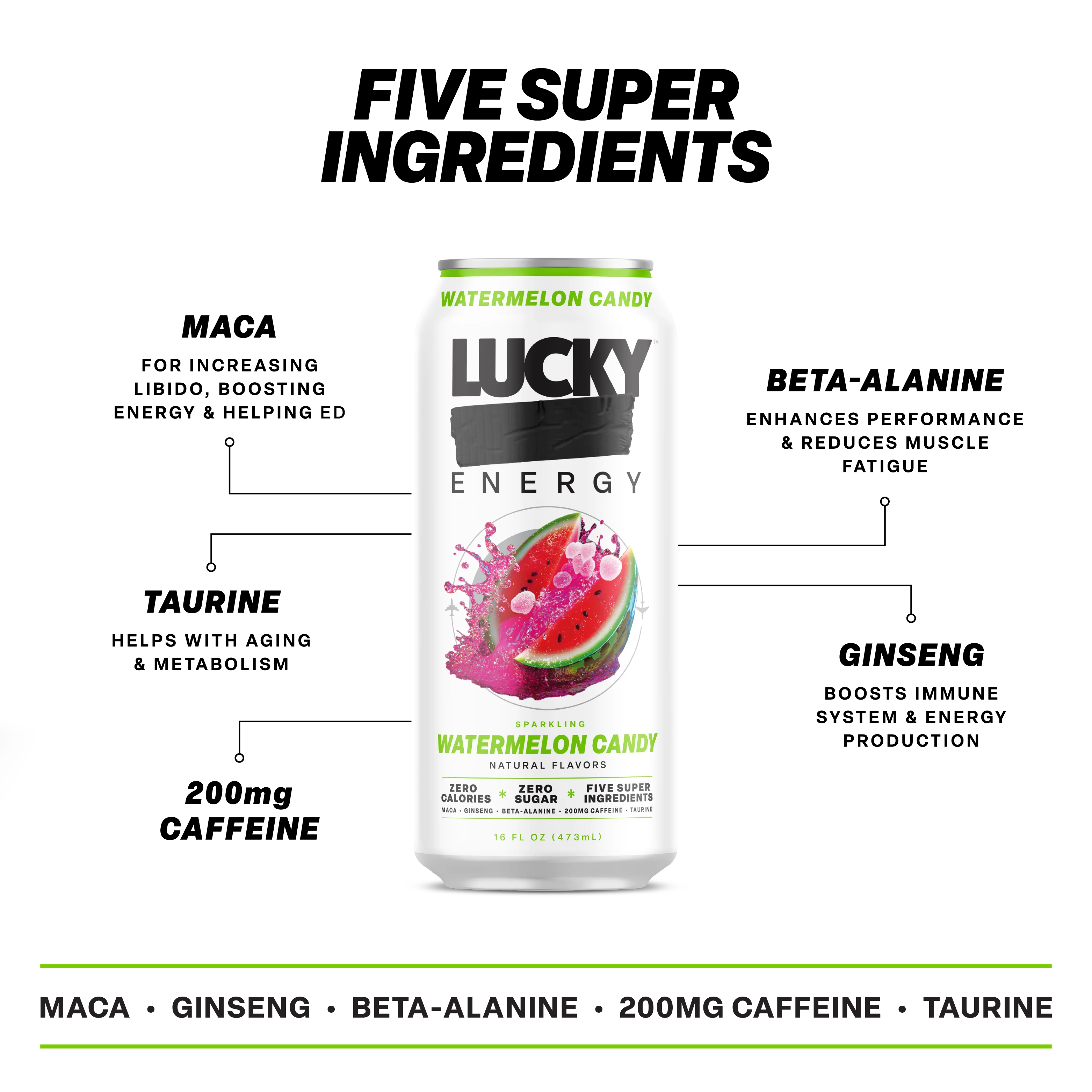 Each can is powered by 5 super ingredients - maca, ginseng, taurine, beta-alanine, and 200mg of caffeine - to keep your mind sharp, your focus locked, and your energy levels dialed in.